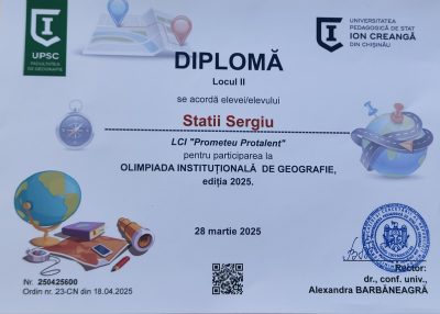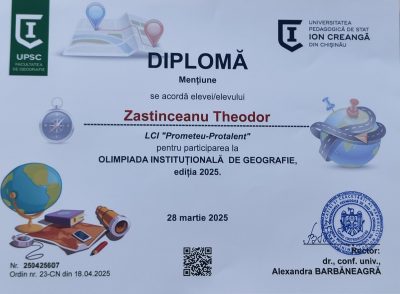 Participarea elevilor Sergiu Statii și Theodor Zastânceanu din clasa a XI-a „B” a Liceului de Creativitate și Inventică „Prometeu-Protalent” la Olimpiada instituțională de Geografie, ediția 2025, a fost apreciată cu Diplomă de gradul II și Diplomă de Mențiune pentru cunoștințe temeinice la disciplina geografie.