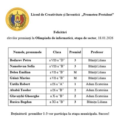 Elevii Liceului de Creativitate și Inventică „Prometeu-Protalent” au câștigat toate premiile posibile la Olimpiada de informatică, etapa de sector, care a avut loc pe data de 18 ianuarie 2026. Ei au obținut, în baza cunoștințelor demonstrate, calificativul Premiul I până la calificativul Mențiune, după cum urmează: